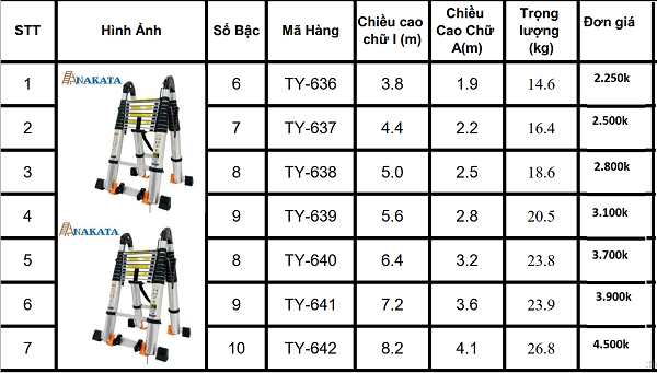 THÔNG SỐ KỸ THUẬT CỦA THANG NHÔM RÚT ĐÔI NAKATA 3M8 - TY636