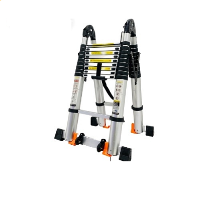 Bước 1: Đặt thang nhôm rút đôi dựng thẳng đứng trên nền nhà. Phần cuối thang 2 bên chống vào sàn nhà theo hình chữ A cho chắc chắn