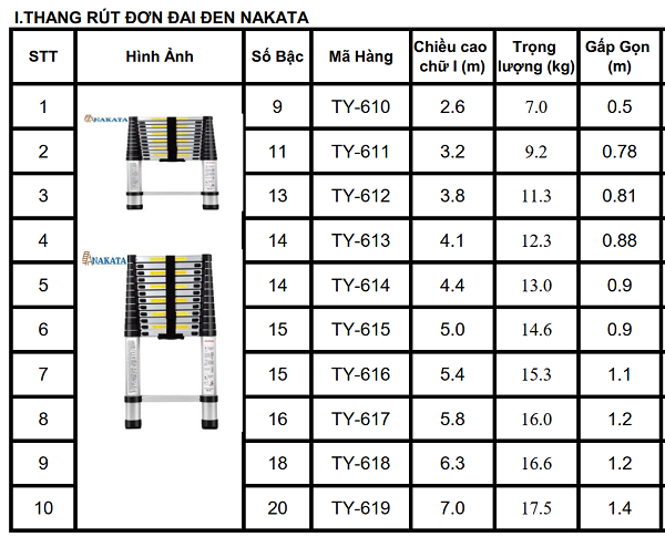 THÔNG SỐ KỸ THUẬT CỦA THANG NHÔM NAKATA 5.0M - TY615